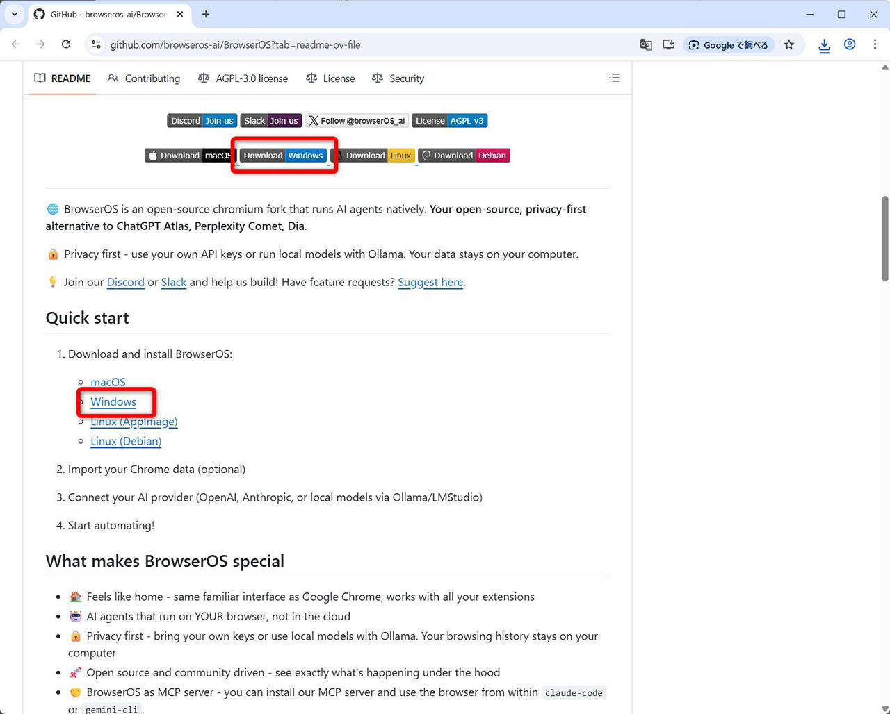 AGPL-3.0 ライセンスのため、BrowserOS 自体は無料で利用でき、商用利用も可能です。
