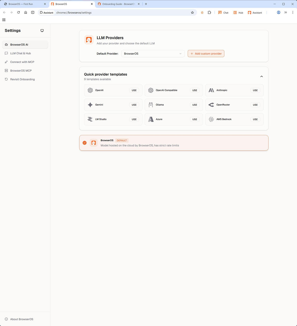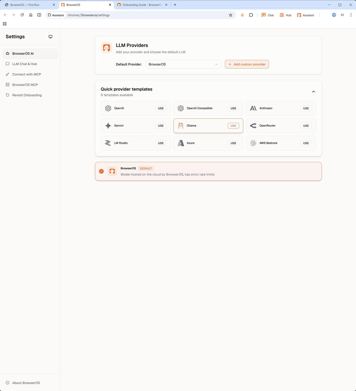 AI Provider として BrowserOS を選択すると以下のような形です。