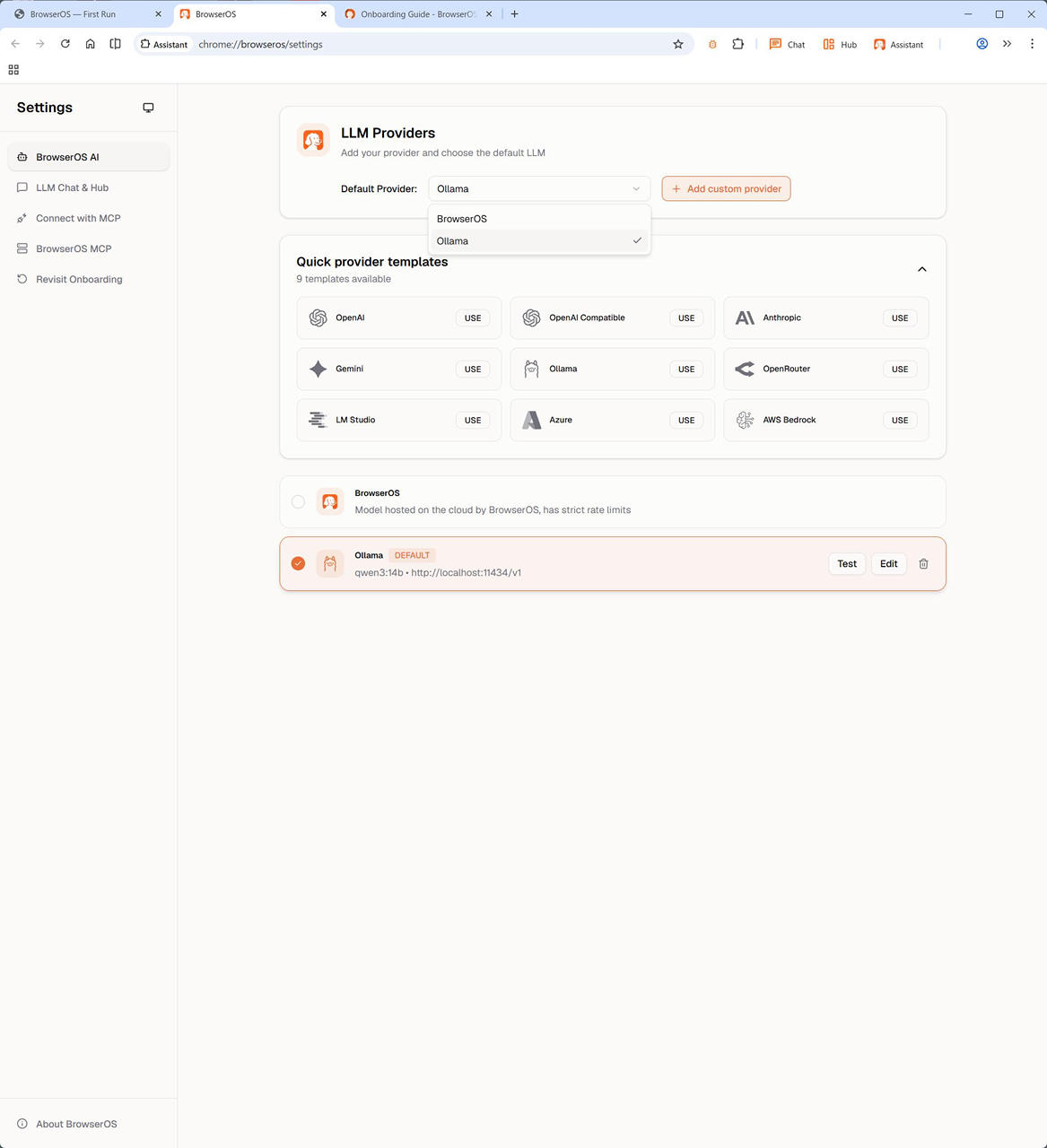 今回は、BrowserOS と Ollama を連携させて利用してみました。