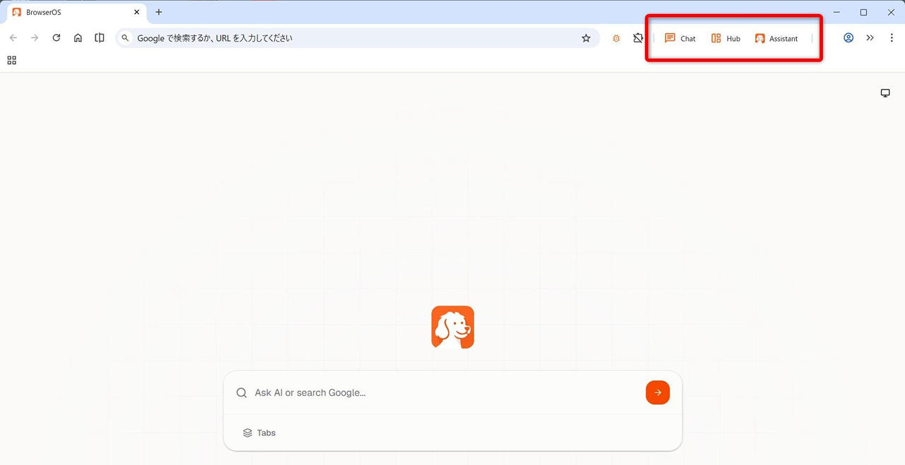 BrowserOS - 右上に Chat, Hub, Assistant のボタンがある