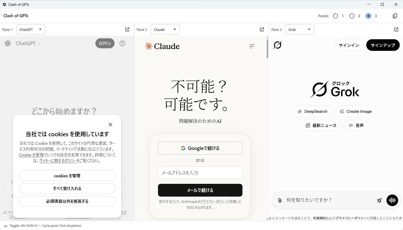 ChatGPT、Claude、Grok、Gemini、Perplexity などとチャットできます。