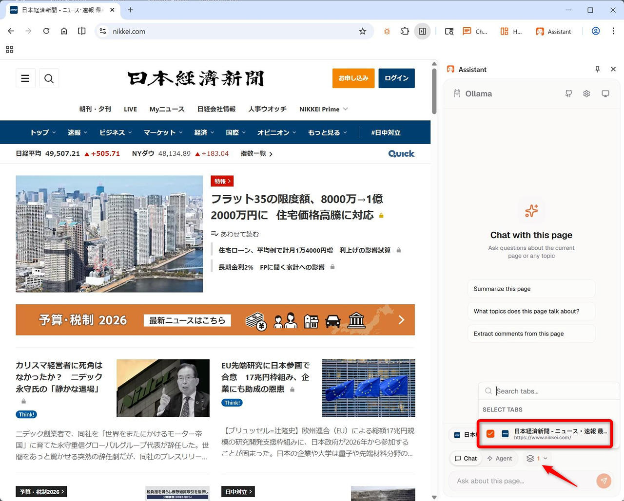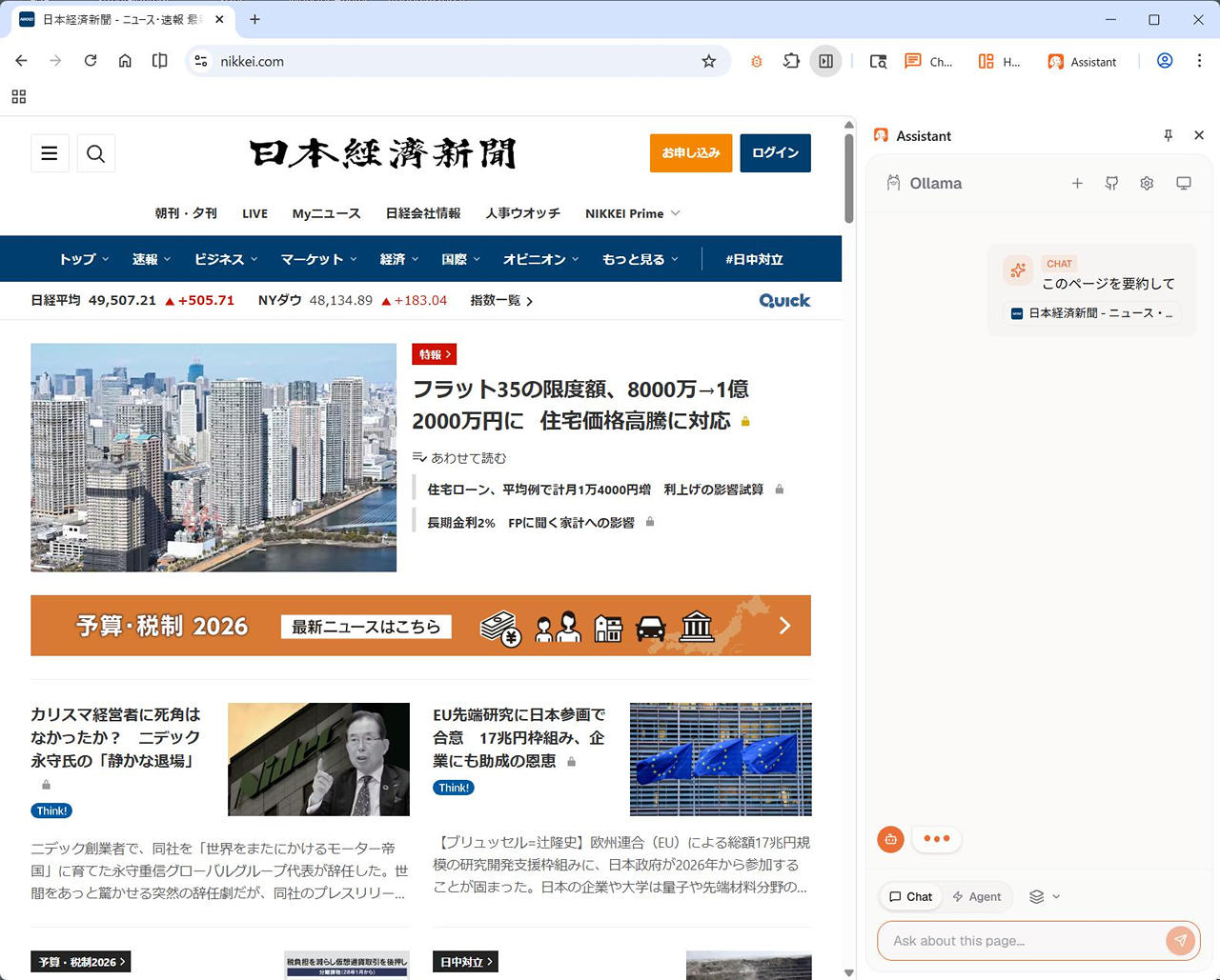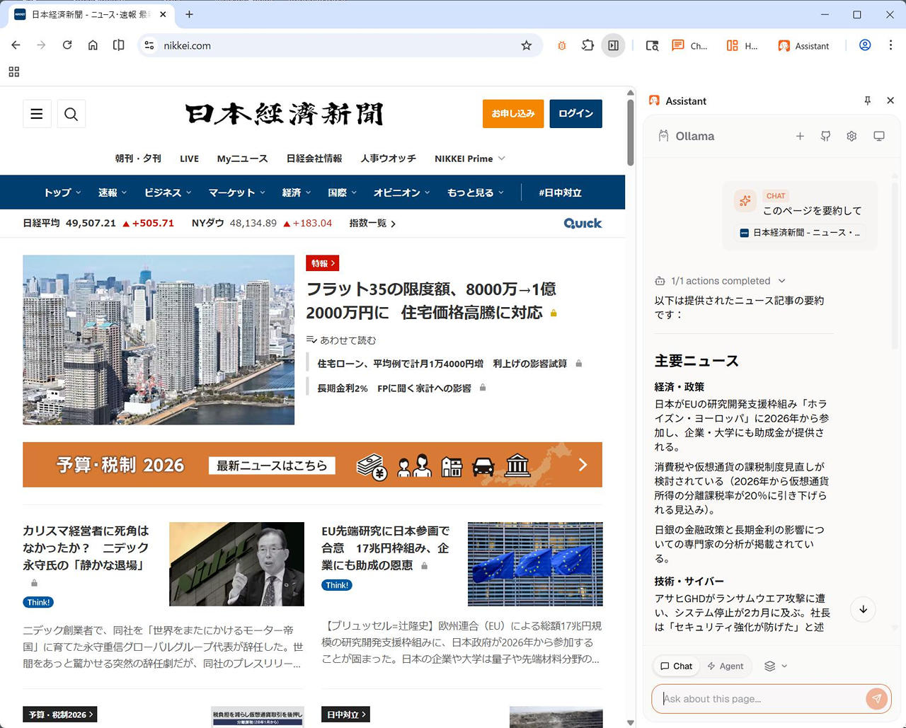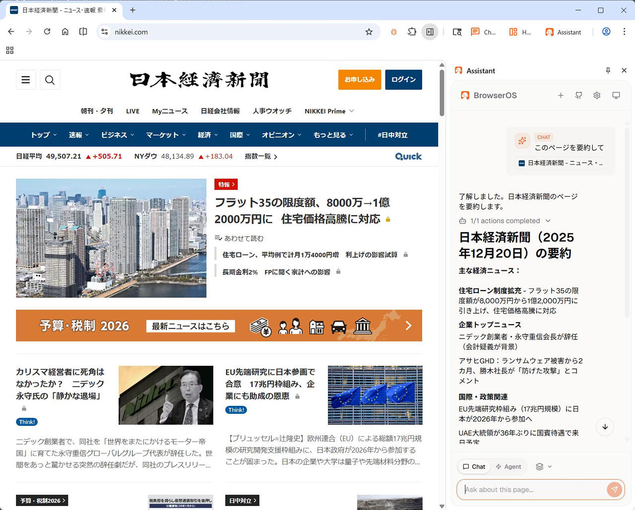 BrowserOS の AI Provider - Chat モード - 日経新聞のサイトの要約結果