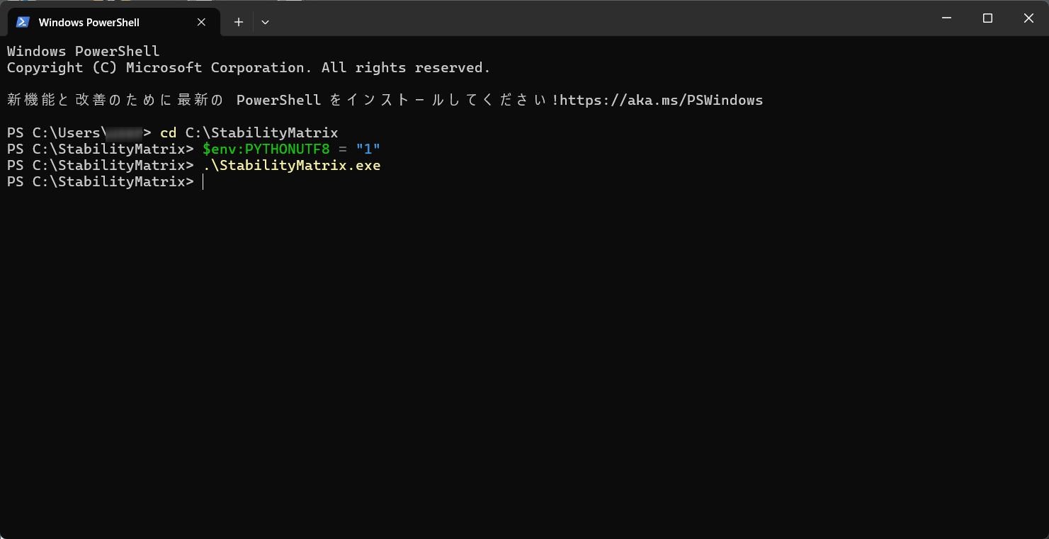 以下では、Fooocus のインストール時に日本語環境だと文字コードの違いによってエラーとなるので、UTF-8 を強制して Stability Matrix を起動しています。