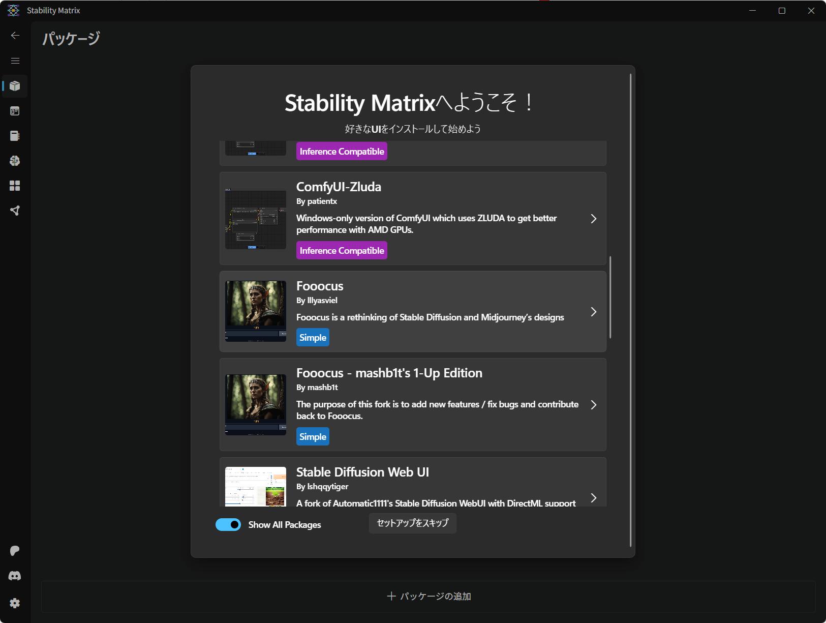 初めて Stability Matrix を利用する場合は、初回のセットアップウィザード中に Fooocus を選択すればインストールできます。
