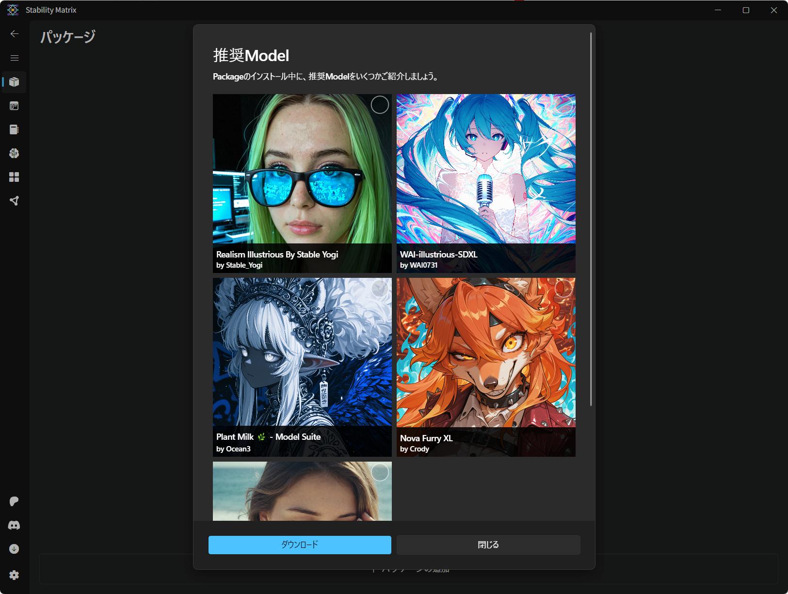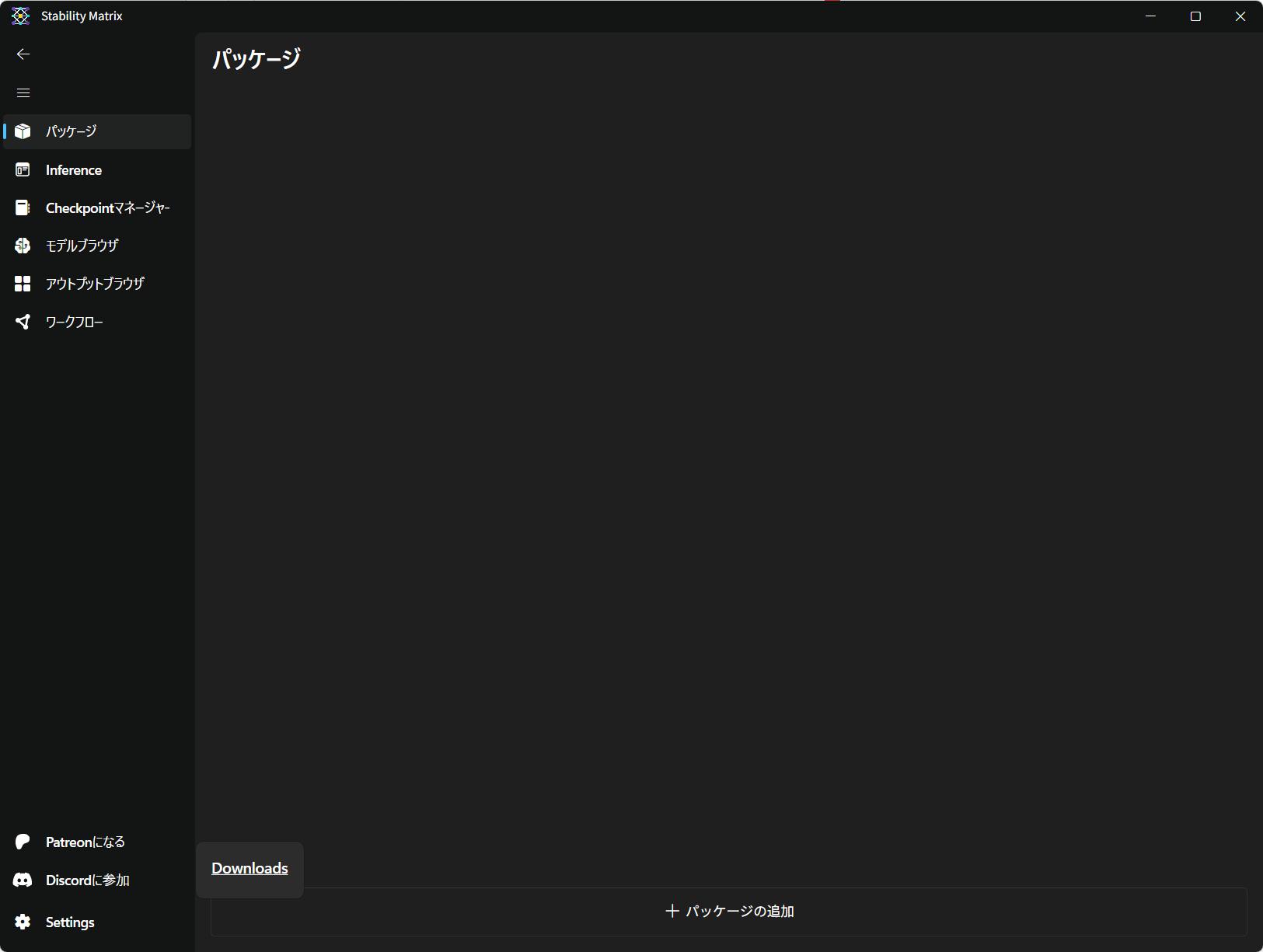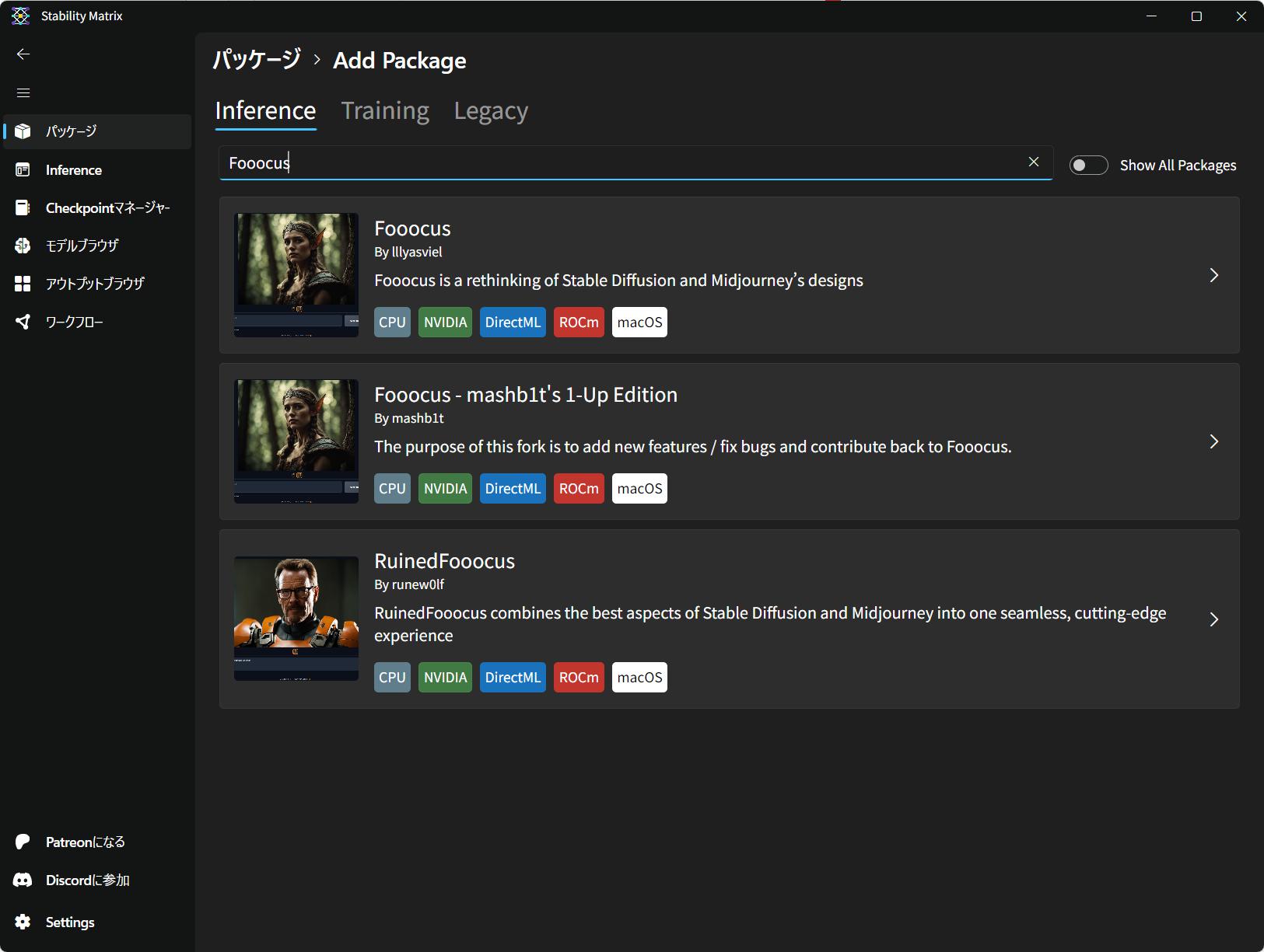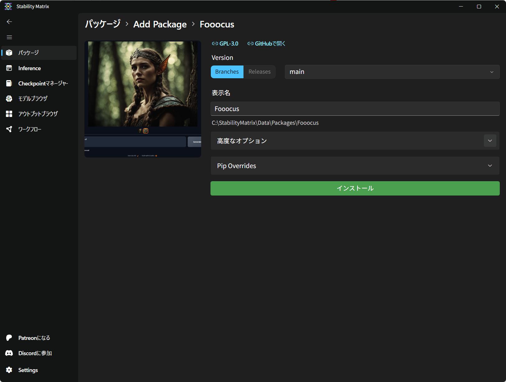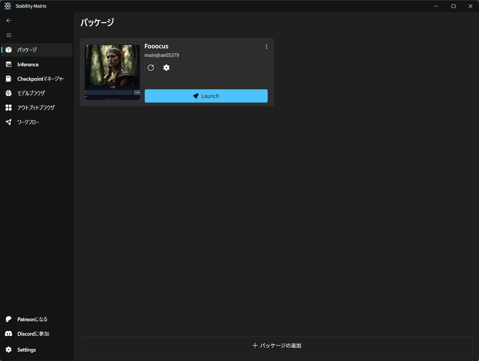 既存環境を利用する場合は、Stability Matrix を起動後、左側 [パッケージ] – 右下 [+パッケージの追加] から Fooocus で検索し、表示された [Fooocus] をクリック – [インストール] からインストール可能です。