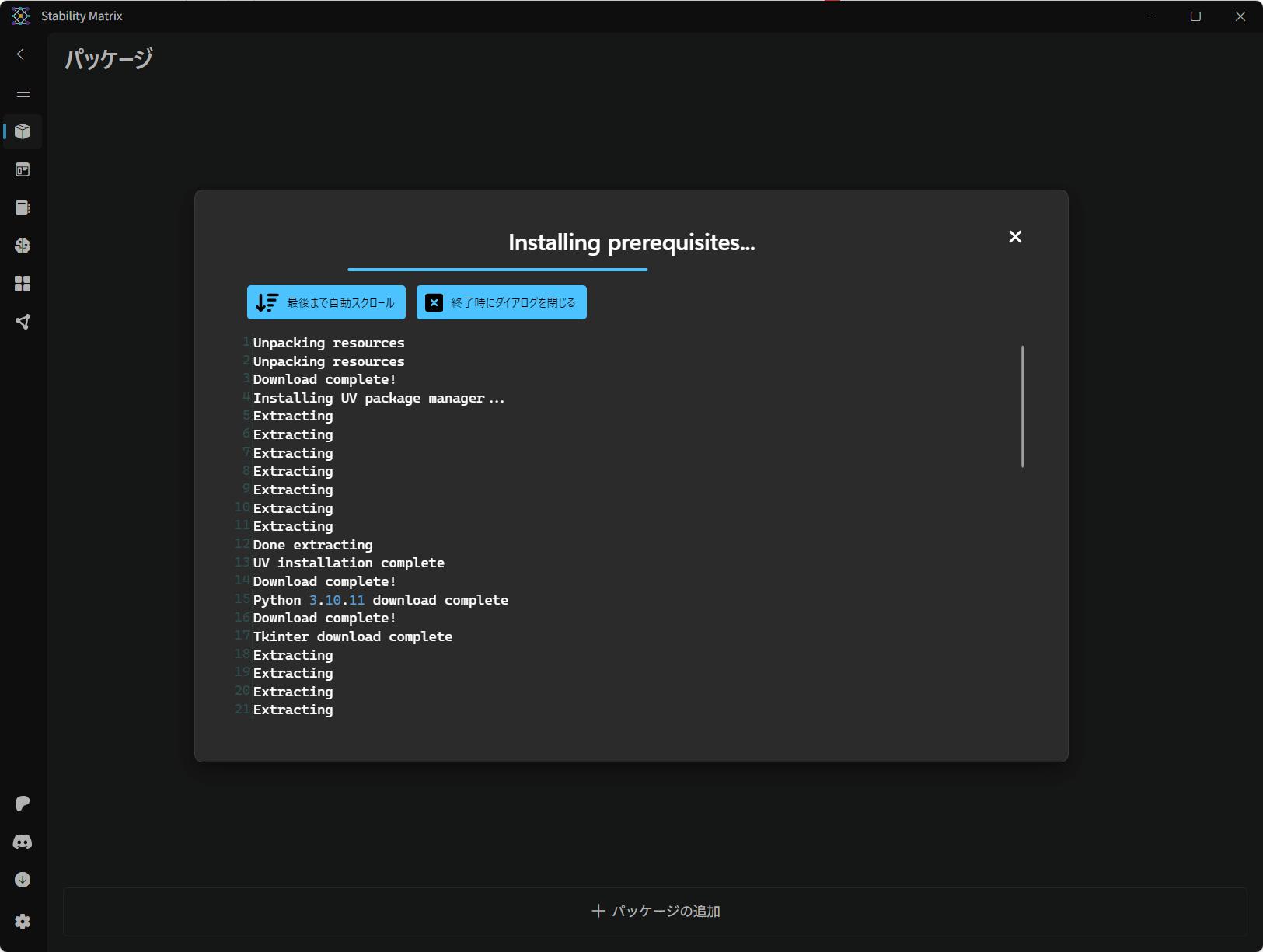 以下は、初回起動のウィザードではインストールせずに、後からパッケージの追加をした際のスクリーンショットです。