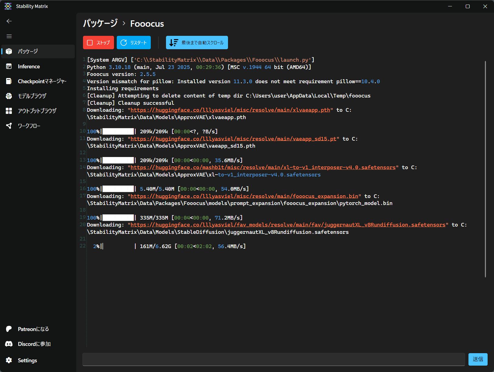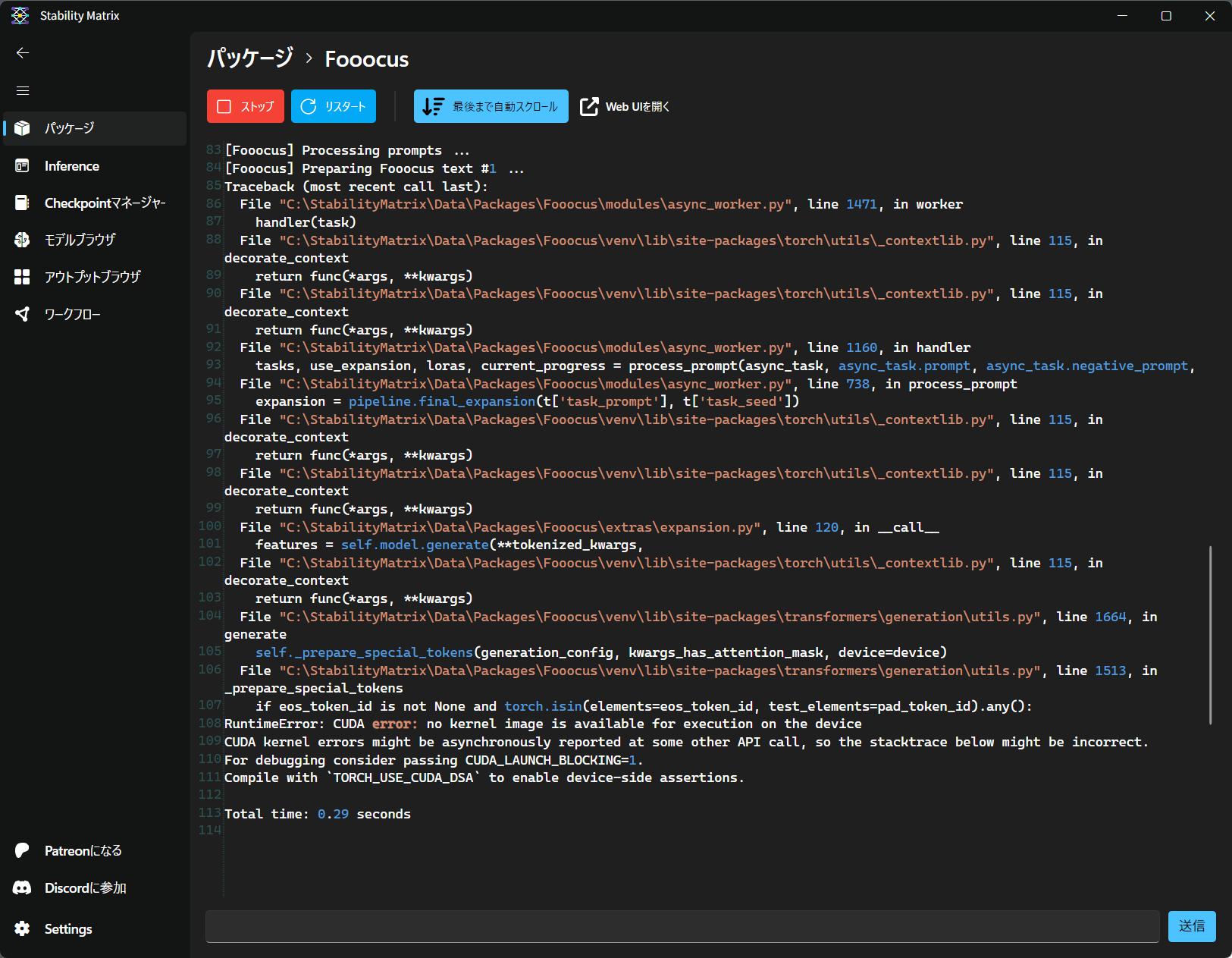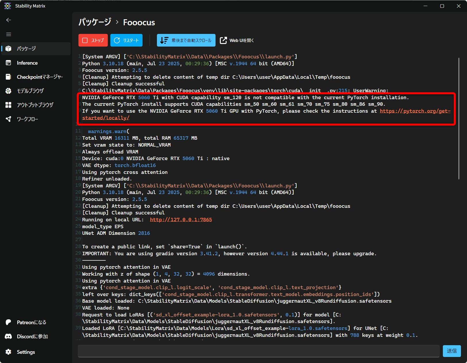よく見ると Fooocus 起動時にもエラーが発生していることがわかります。