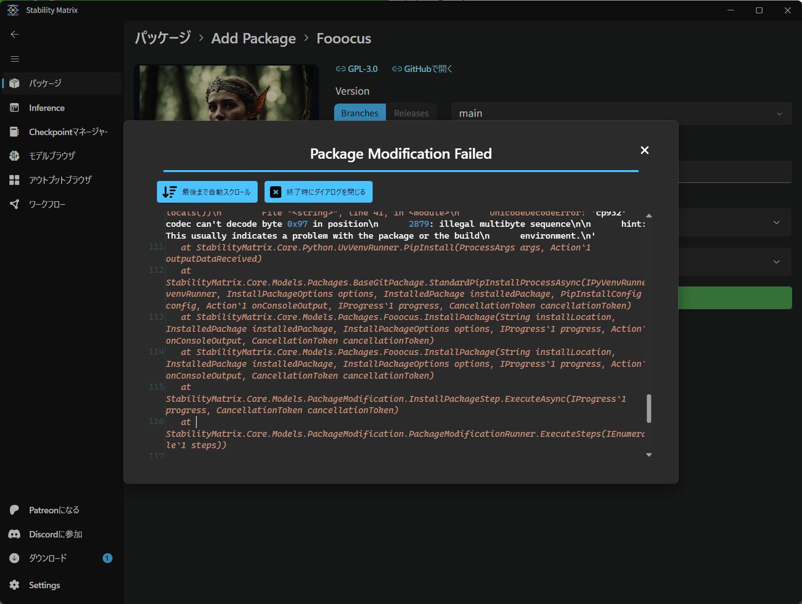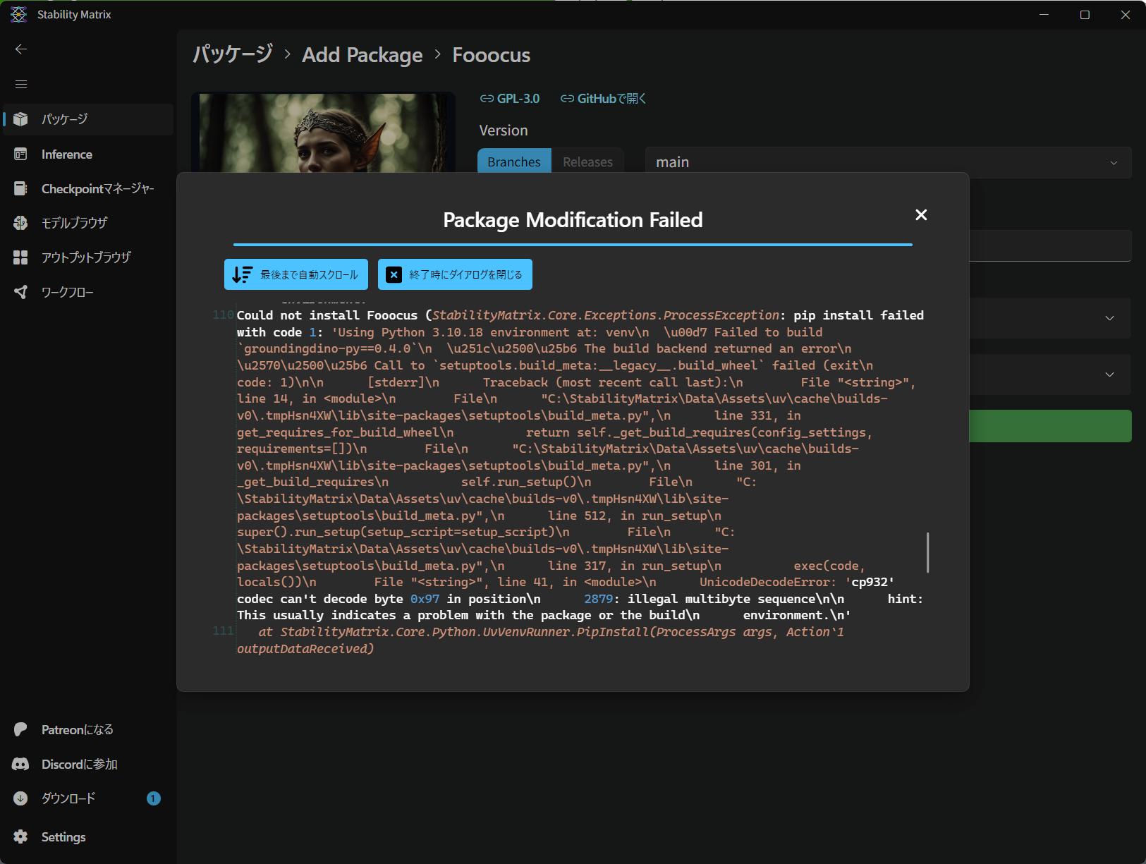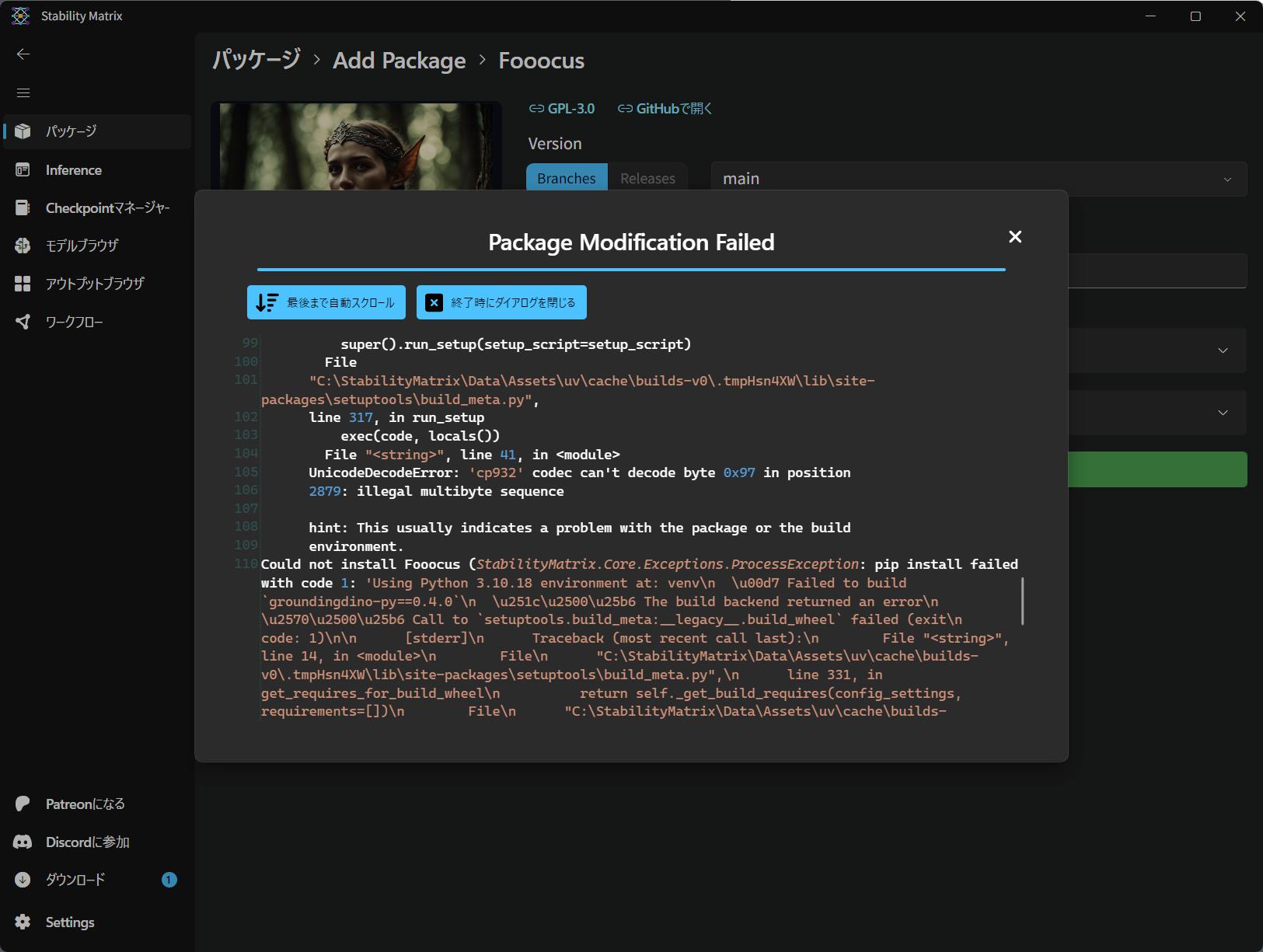 Could not install Fooocus (StabilityMatrix.Core.Exceptions.ProcessException: pip install failed with code 1: 'Using Python 3.10.18 environment at: venv\n \u00d7 Failed to build `groundingdino-py==0.4.0`\n \u251c\u2500\u25b6 The build backend returned an error\n \u2570\u2500\u25b6 Call to `setuptools.build_meta:__legacy__.build_wheel` failed (exit\n code: 1)\n\n [stderr]\n Traceback (most recent call last):\n File "<string>", line 14, in <module>\n File\n "C:\StabilityMatrix\Data\Assets\uv\cache\builds-v0\.tmp3l9mbb\lib\site-packages\setuptools\build_meta.py",\n line 331, in get_requires_for_build_wheel\n return self._get_build_requires(config_settings, requirements=[])\n File\n "C:\StabilityMatrix\Data\Assets\uv\cache\builds-v0\.tmp3l9mbb\lib\site-packages\setuptools\build_meta.py",\n line 301, in _get_build_requires\n self.run_setup()\n File\n "C:\StabilityMatrix\Data\Assets\uv\cache\builds-v0\.tmp3l9mbb\lib\site-packages\setuptools\build_meta.py",\n line 512, in run_setup\n super().run_setup(setup_script=setup_script)\n File\n "C:\StabilityMatrix\Data\Assets\uv\cache\builds-v0\.tmp3l9mbb\lib\site-packages\setuptools\build_meta.py",\n line 317, in run_setup\n exec(code, locals())\n File "<string>", line 41, in <module>\n UnicodeDecodeError: 'cp932' codec can't decode byte 0x97 in position\n 2879: illegal multibyte sequence\n\n hint: This usually indicates a problem with the package or the build\n environment.\n'