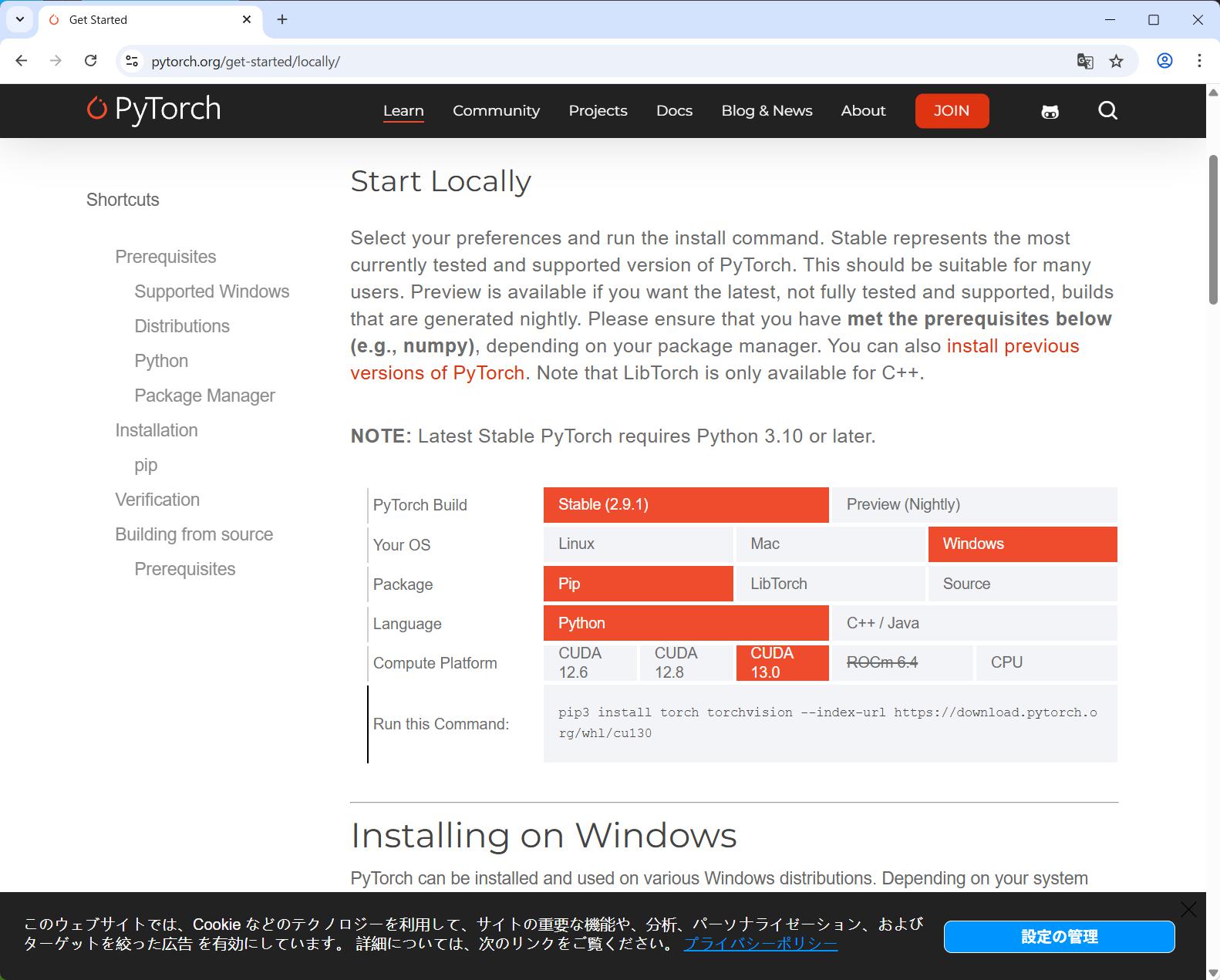 インストール用のコマンドは PyTorch のサイトで確認できます。