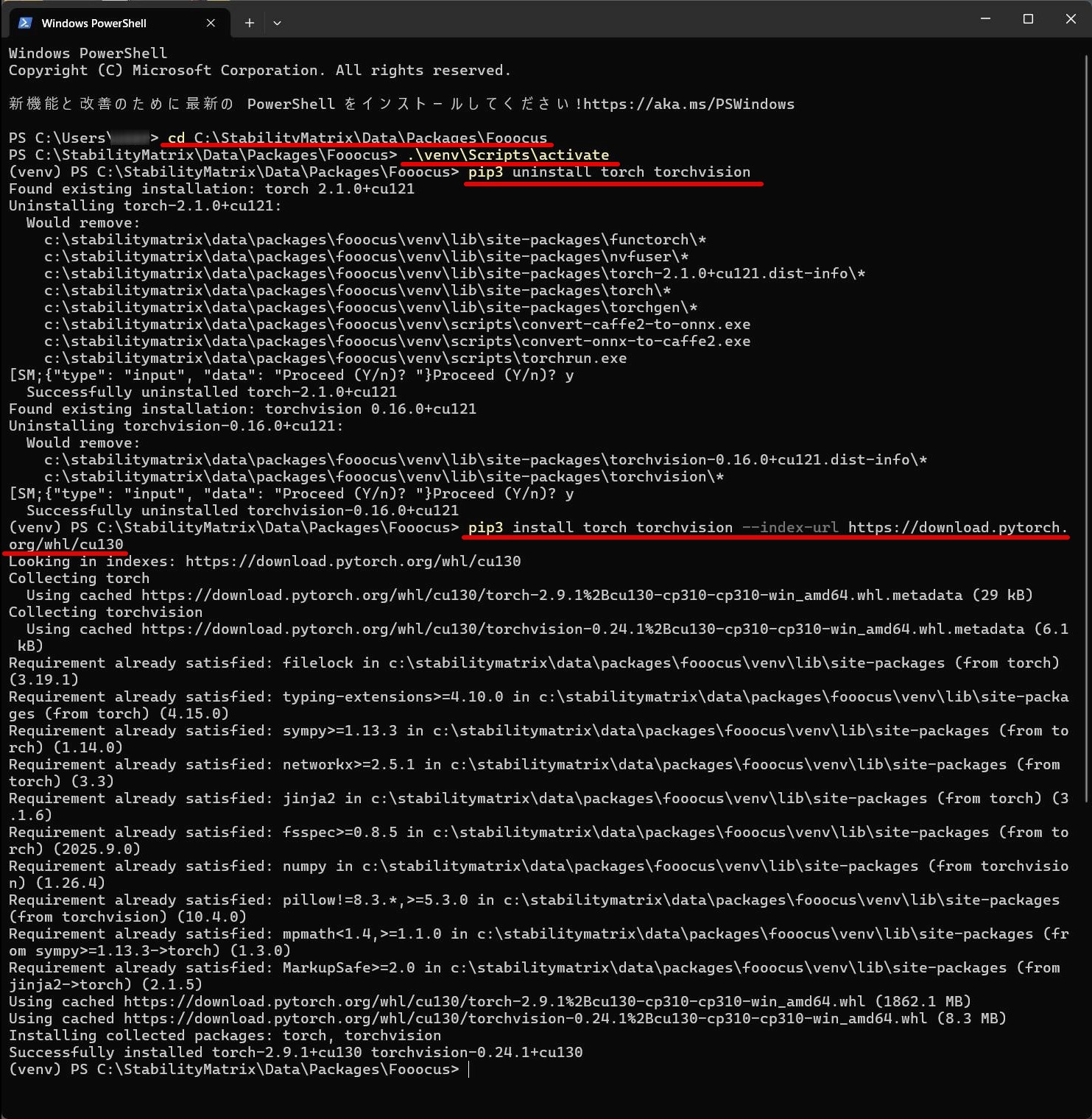 NVIDIA GeForce RTX 5060 Ti を利用した環境の場合は、Fooocus と一緒にインストールされる PyTorch が sm_120 に対応していないため、画像生成時にエラーになるので以下も実行します。