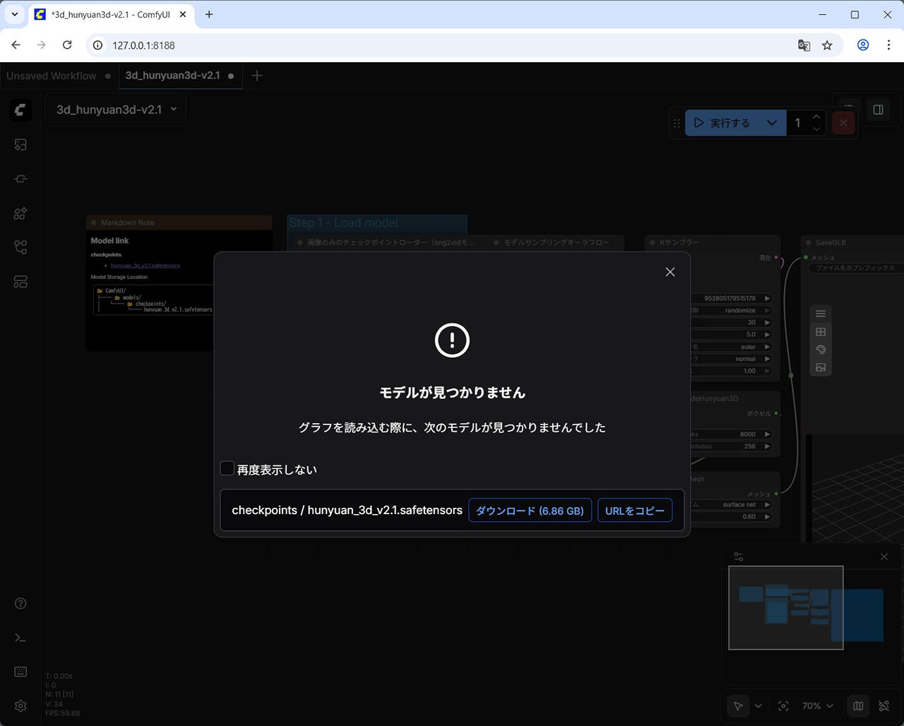 ワークフローが開き、必要なチェックポイントファイルが不足している場合は、ポップアップが表示されるため、そのままダウンロードします。