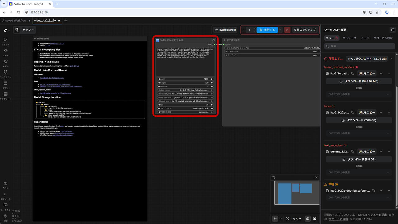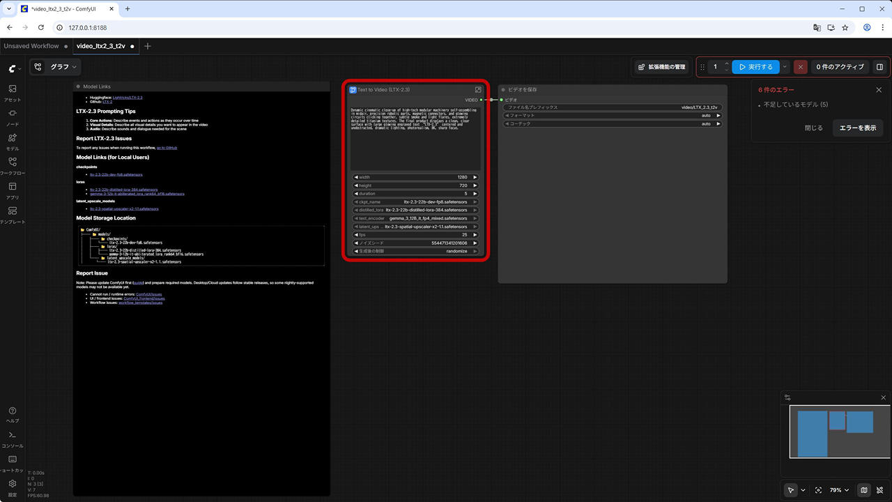 (3) ワークフローが開きます。必要なモデルトファイルが不足している場合は、エラーが表示されます。