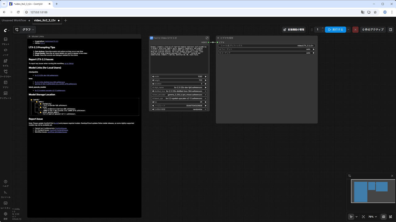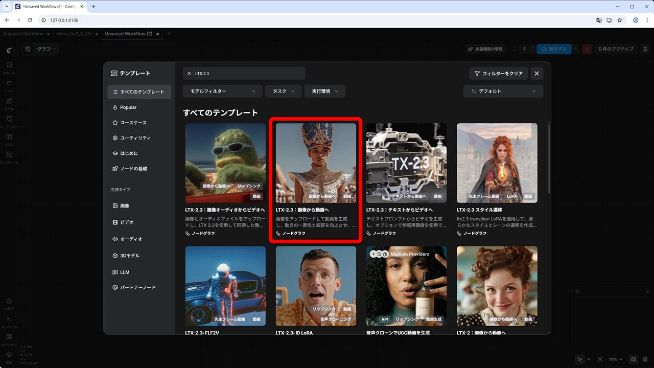 ComfyUI の Web UI – 左側メニューの [テンプレート] – [LTX-2.3 : テキストからビデオへ]