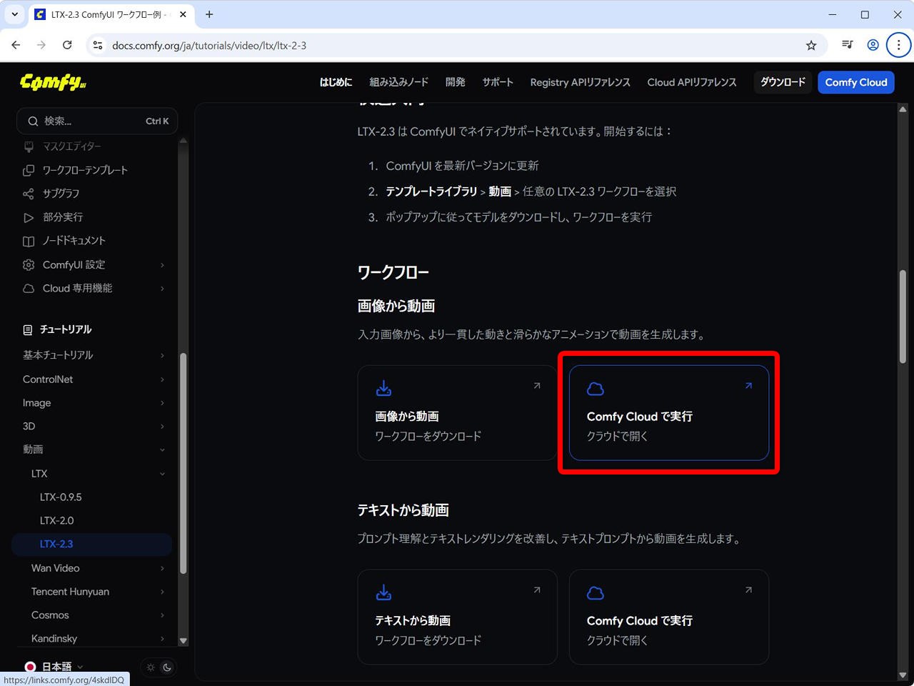 (1) 画像から動画 → Comfy Cloudで実行 をクリック