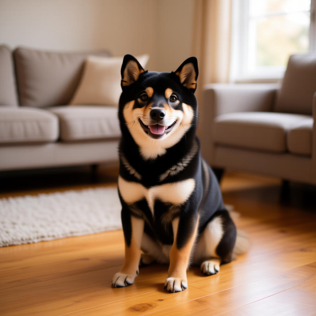 Prompt と Negative Prompt の工夫して、リビングでお座りしている形を目指したのが以下です。