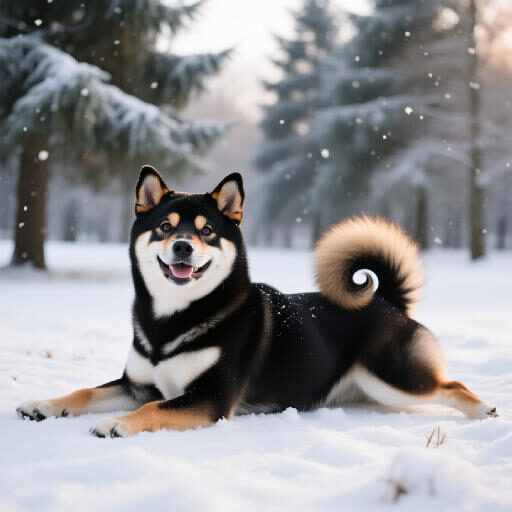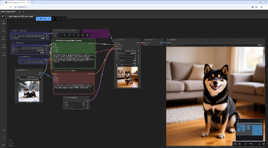 同じワークフローを使って、以前 Qwen Image で生成した柴犬の画像の背景とポーズを変えてみます。