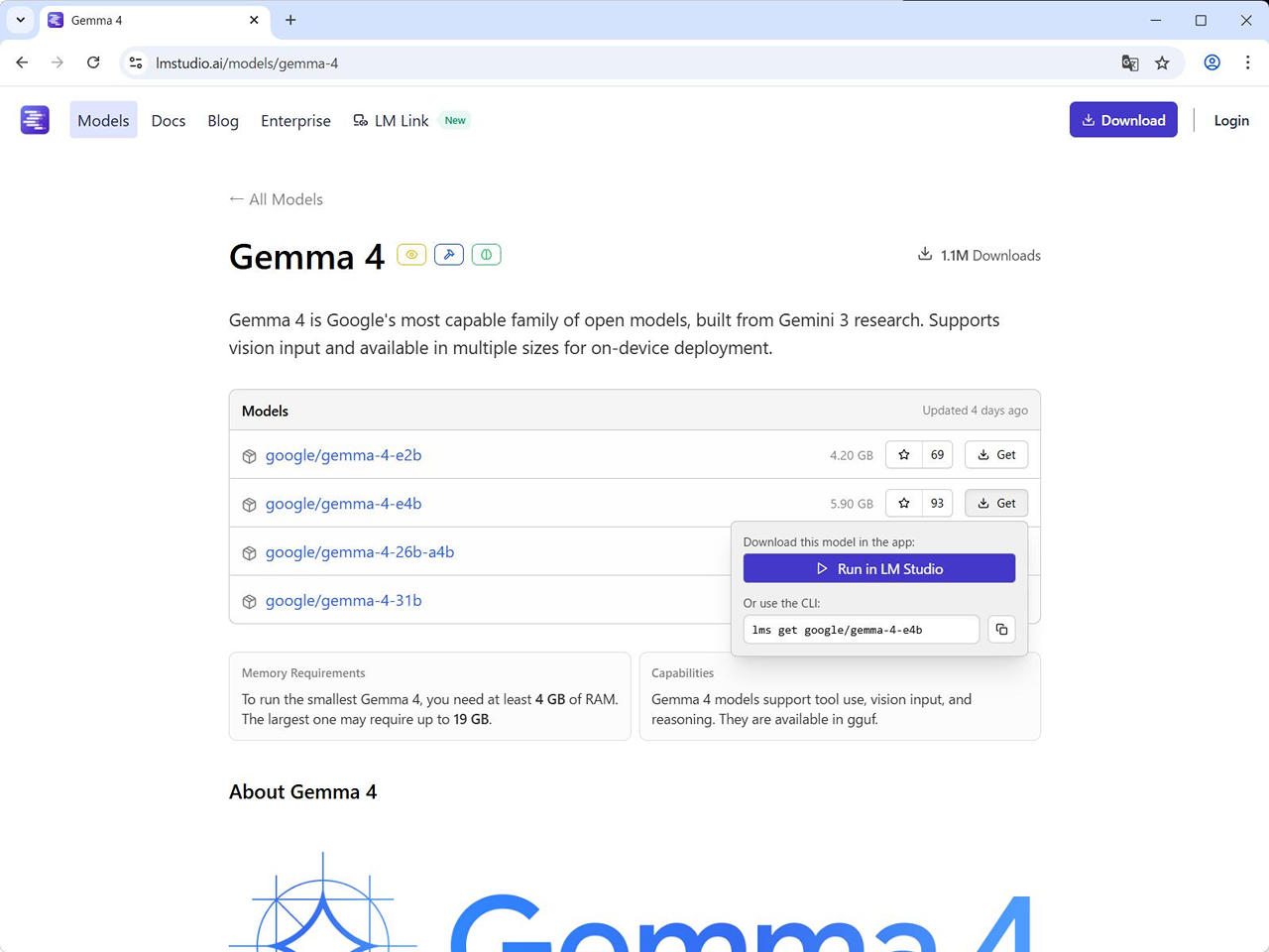 (2) ダウンロードしたいモデル (ここでは Gemma 4) を探してクリックします。