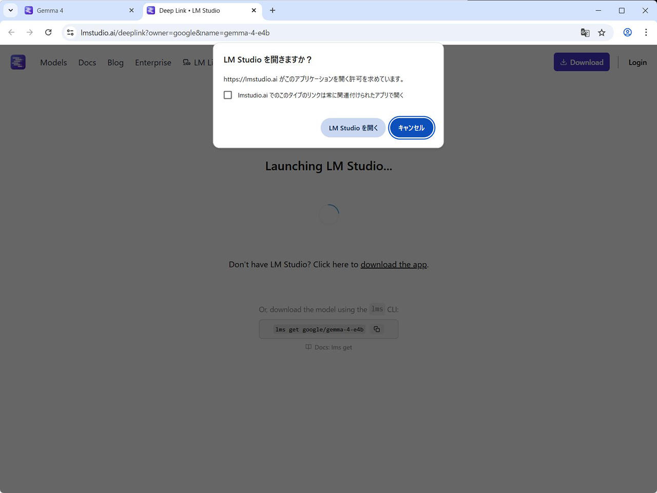 (4) [LM Studio で開く]をクリックして、LM Studio なアプリケーションから開きダウンロードを行います。