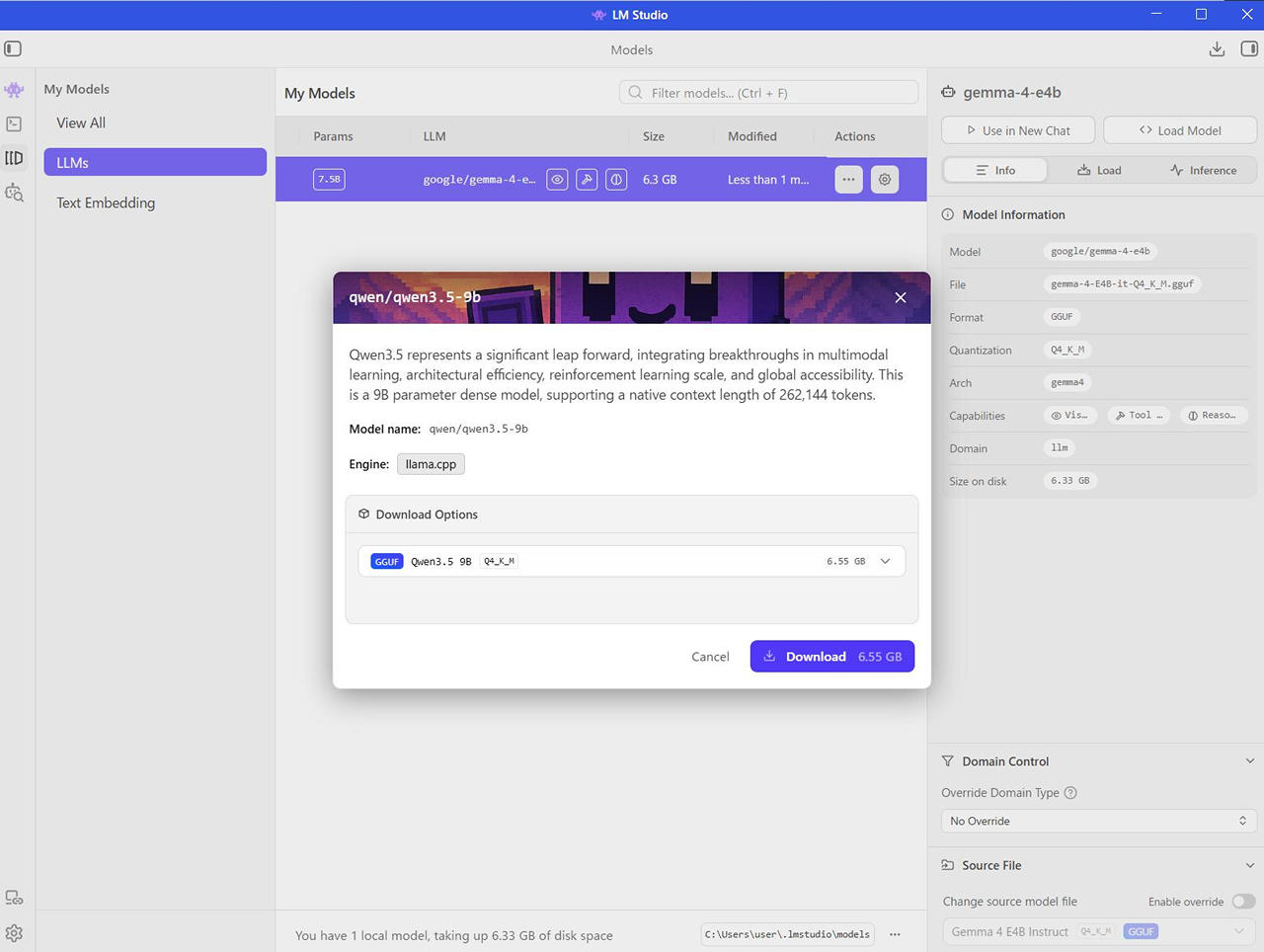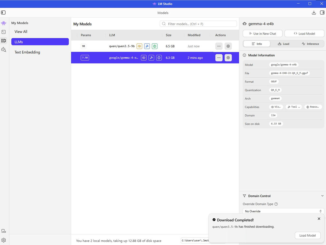 今回は、Qwen 3.5 9B と それと同じくらいのファイルサイズのGemma 4 E4B をダウンロードしました。