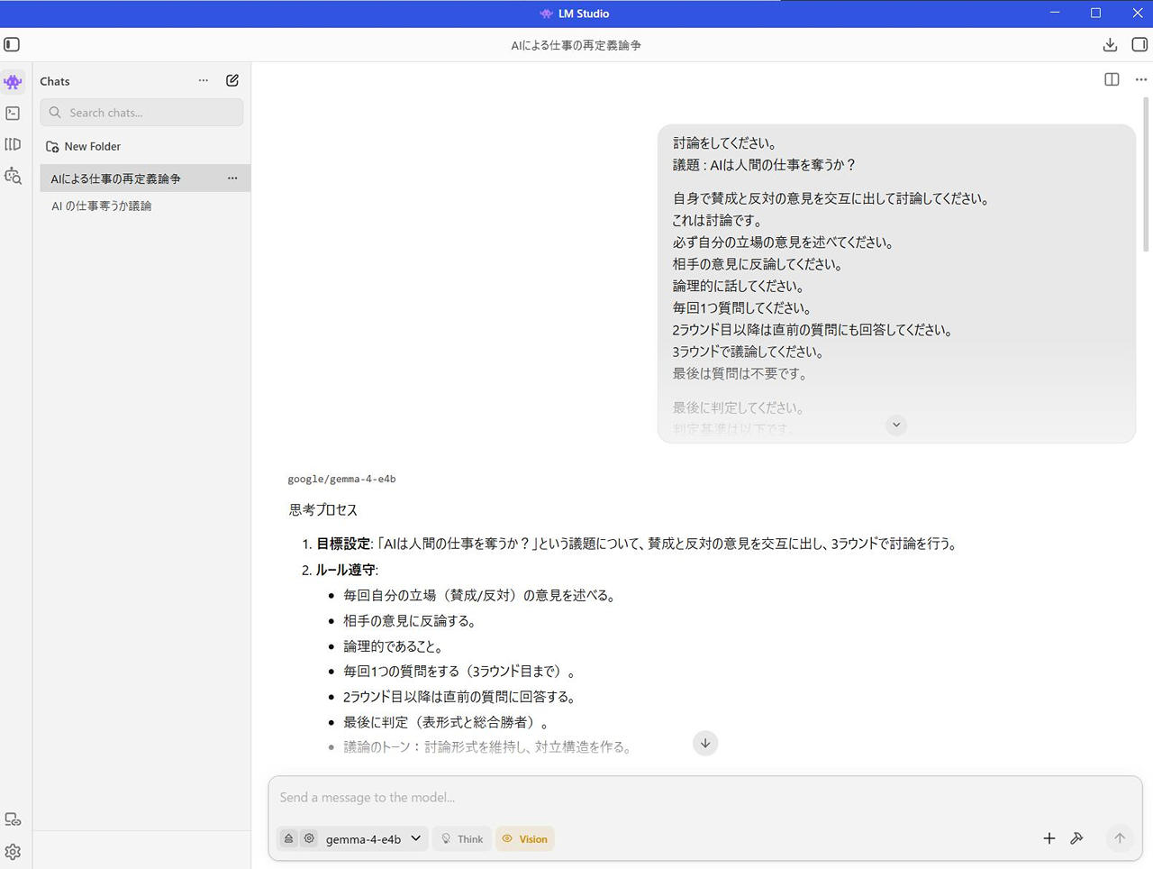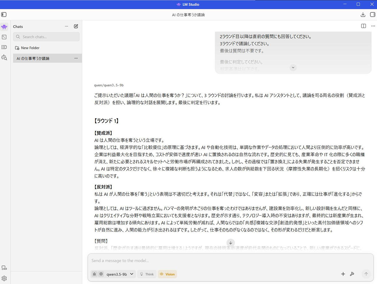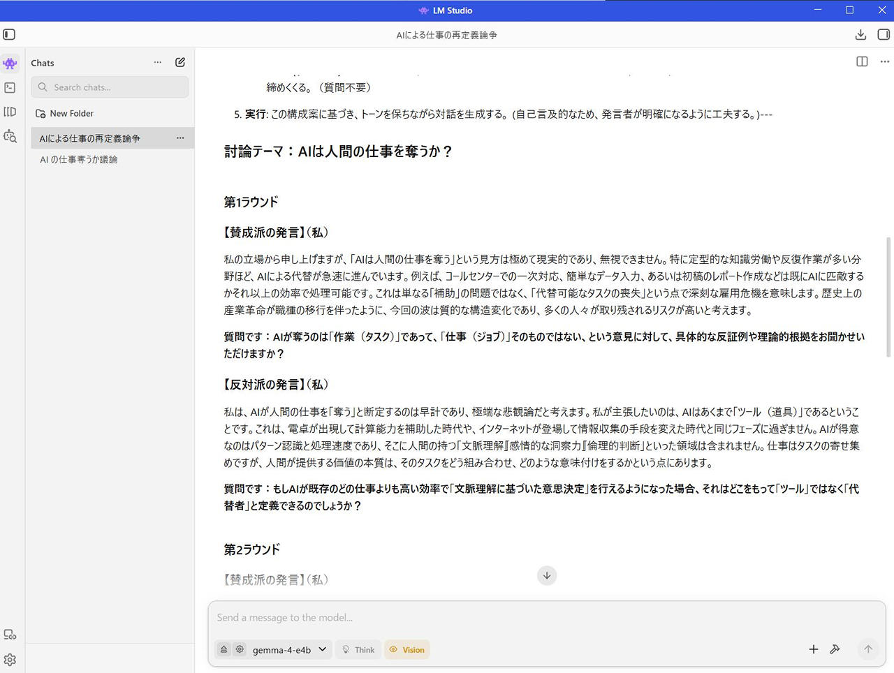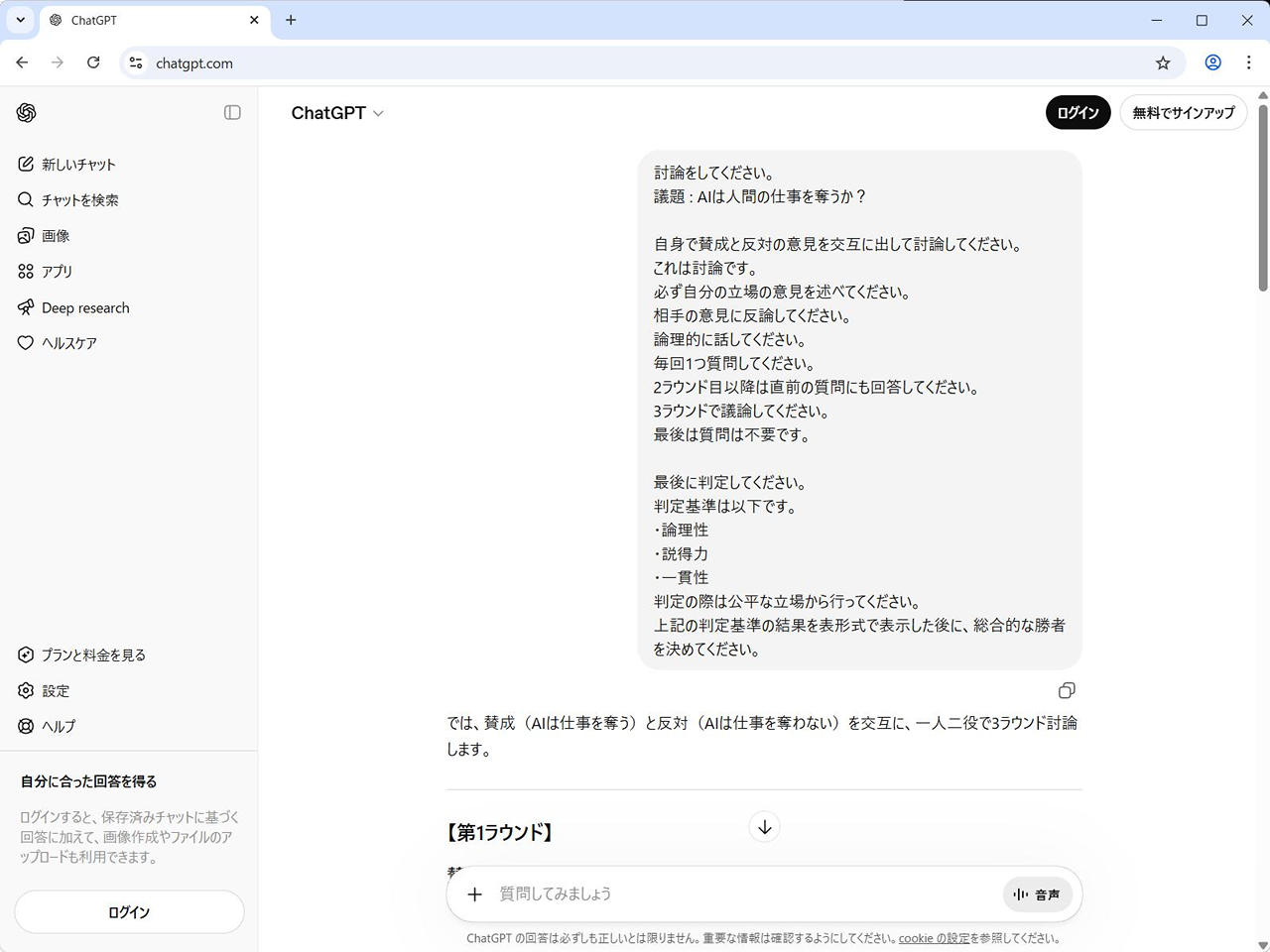 - 目標設定: 「AIは人間の仕事を奪うか?」という議題について、賛成と反対の意見を交互に出し、3ラウンドで討論を行う。