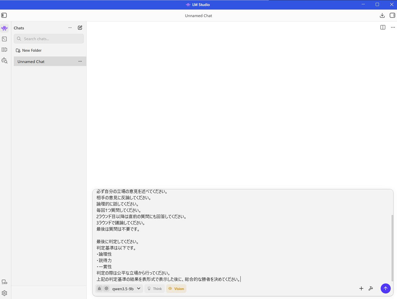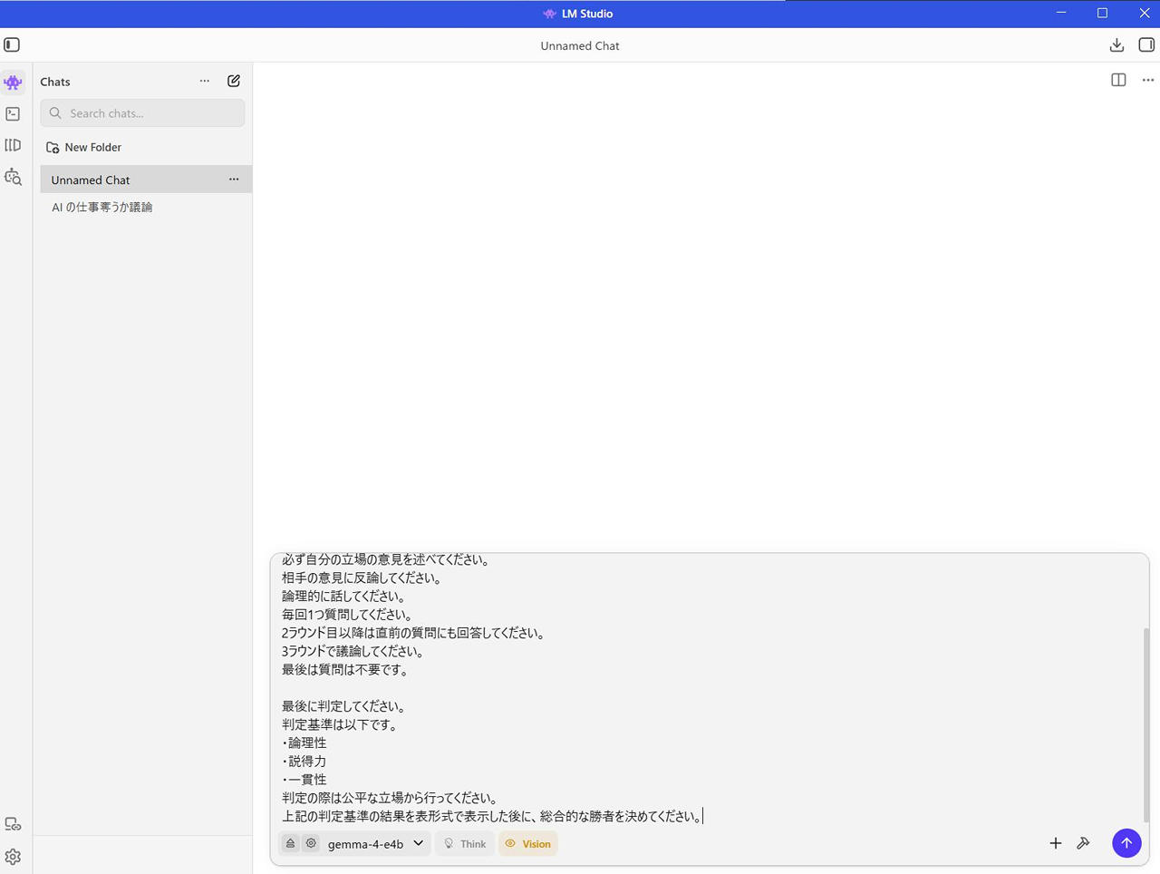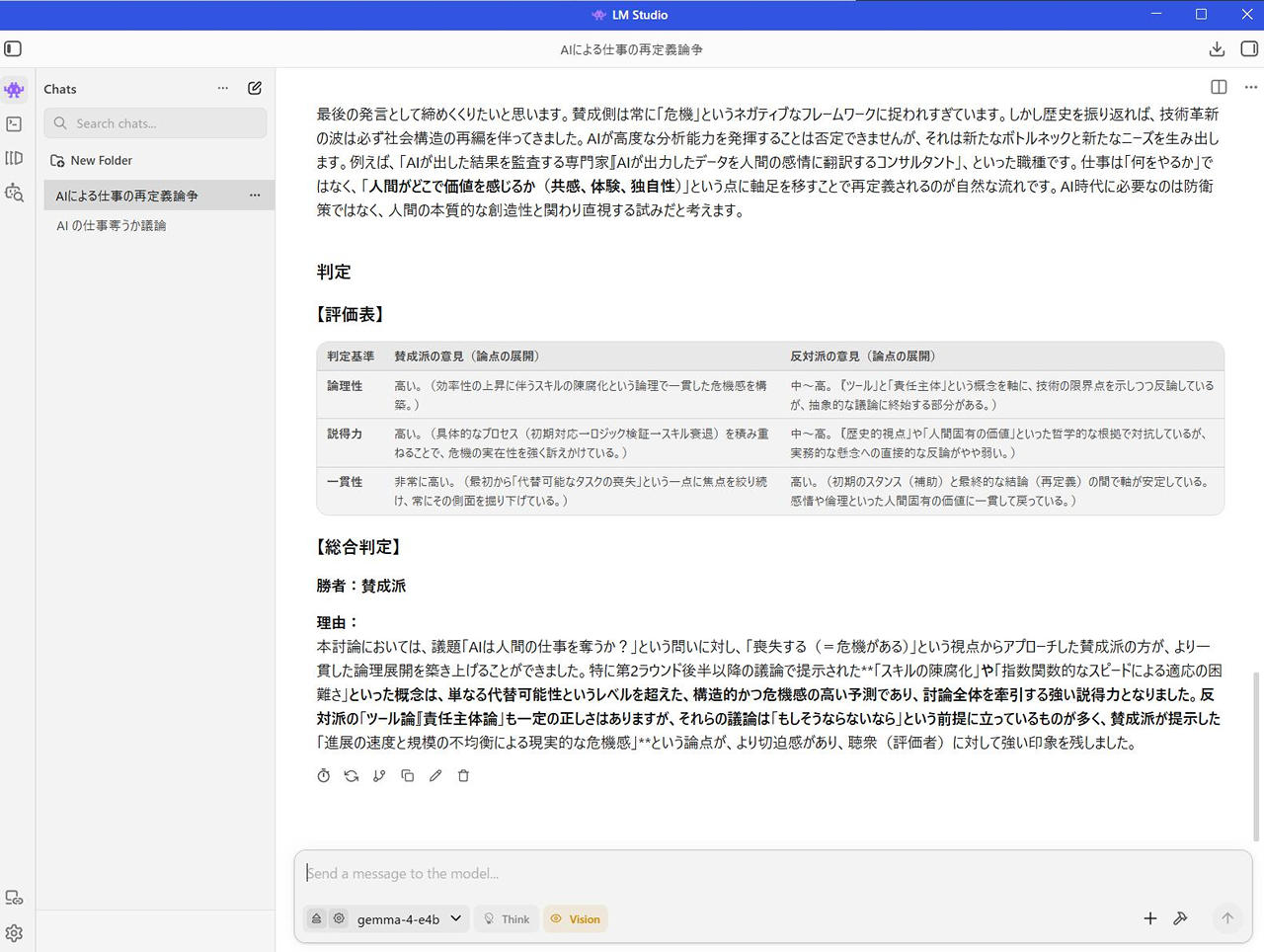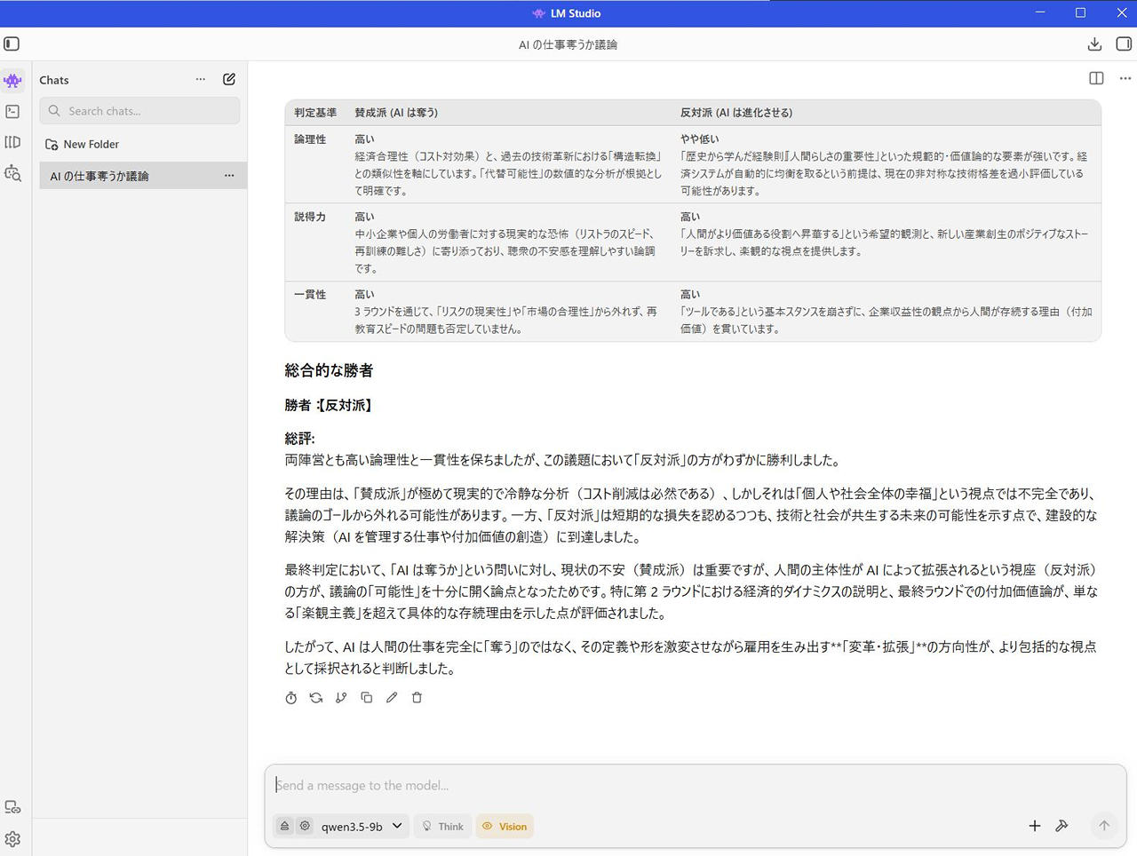 - 目標設定: 「AIは人間の仕事を奪うか?」という議題について、賛成と反対の意見を交互に出し、3ラウンドで討論を行う。