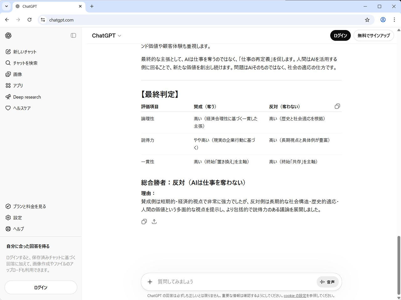 その理由は、「賛成派」が極めて現実的で冷静な分析(コスト削減は必然である)、しかしそれは「個人や社会全体の幸福」という視点では不完全であり、議論のゴールから外れる可能性があります。一方、「反対派」は短期的な損失を認めるつつも、技術と社会が共生する未来の可能性を示す点で、建設的な解決策(AI を管理する仕事や付加価値の創造)に到達しました。