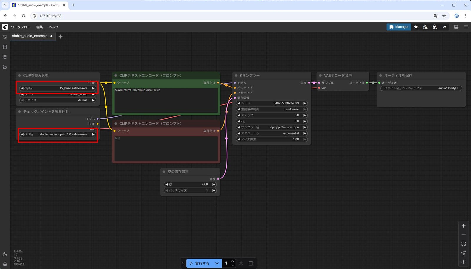 ComfyUI の起動と、Stable Audio Open による音声の生成